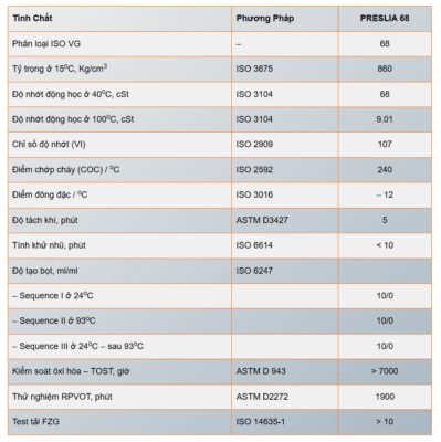 Total Preslia 68 là dầu bôi trơn Tuabin. Được pha chế từ dầu gốc khoáng chất lượng và các phụ gia lựa chọn cẩn thận. Bao gồm chất chống oxi hóa, chất ức chế gỉ và ăn mòn, và chất chống tạo bọt… Các thành phần này mang lại khả năng chống oxi hóa & bảo vệ tối đa ở nhiệt độ cao. Khả năng tách nước, chống tạo nhũ tương & đặc tính chống tạo bọt, đảm bảo hoạt động đáng tin cậy. Dầu được thiết kế đặc biệt để sử dụng trong các ứng dụng Tuabin khí & hơi nước.