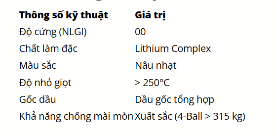 Công thức tổng hợp cao cấp: Hỗ trợ duy trì hiệu quả bôi trơn trong thời gian dài, ngay cả ở nhiệt độ cao hoặc tải lớn.